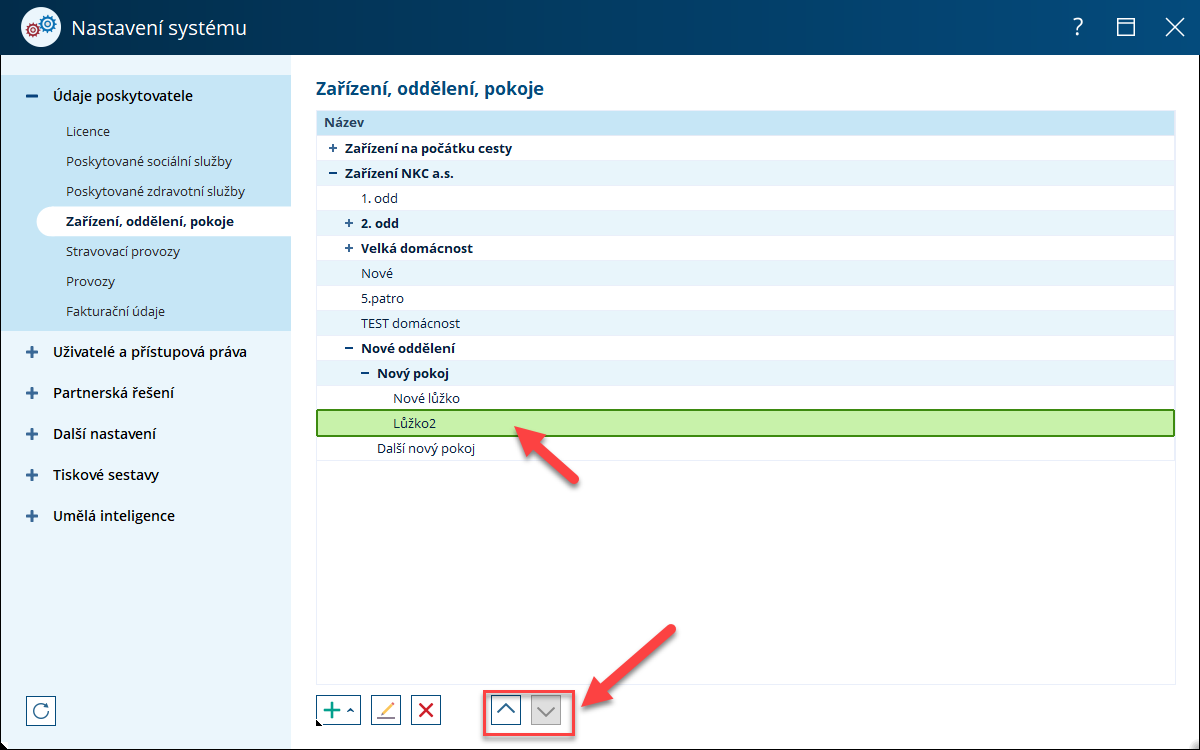 Pořadí v seznamu lůžek pak můžete změnit pomocí šipek.