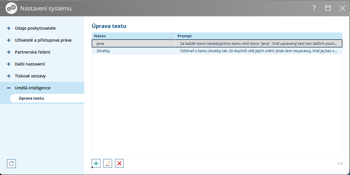 V tomto okně je zobrazen seznam všech uživatelsky definovaných promptů, které lze využít při použití AI funkce pro úpravu textu ve víceřádkových textových polích označených ikonou „kouzelné hůlky“.