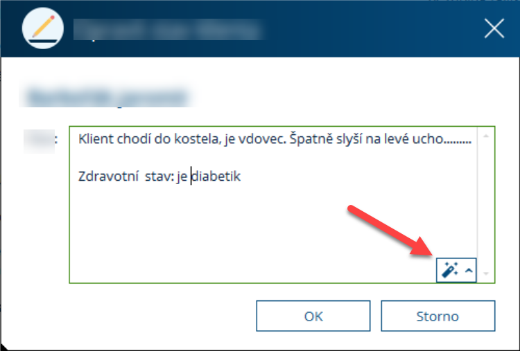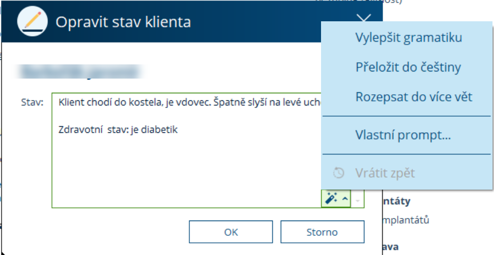 Každé více řádkové textové pole obsahuje v pravém dolním rohu ikonu „kouzelné hůlky“, která slouží pro využití AI funkcí.